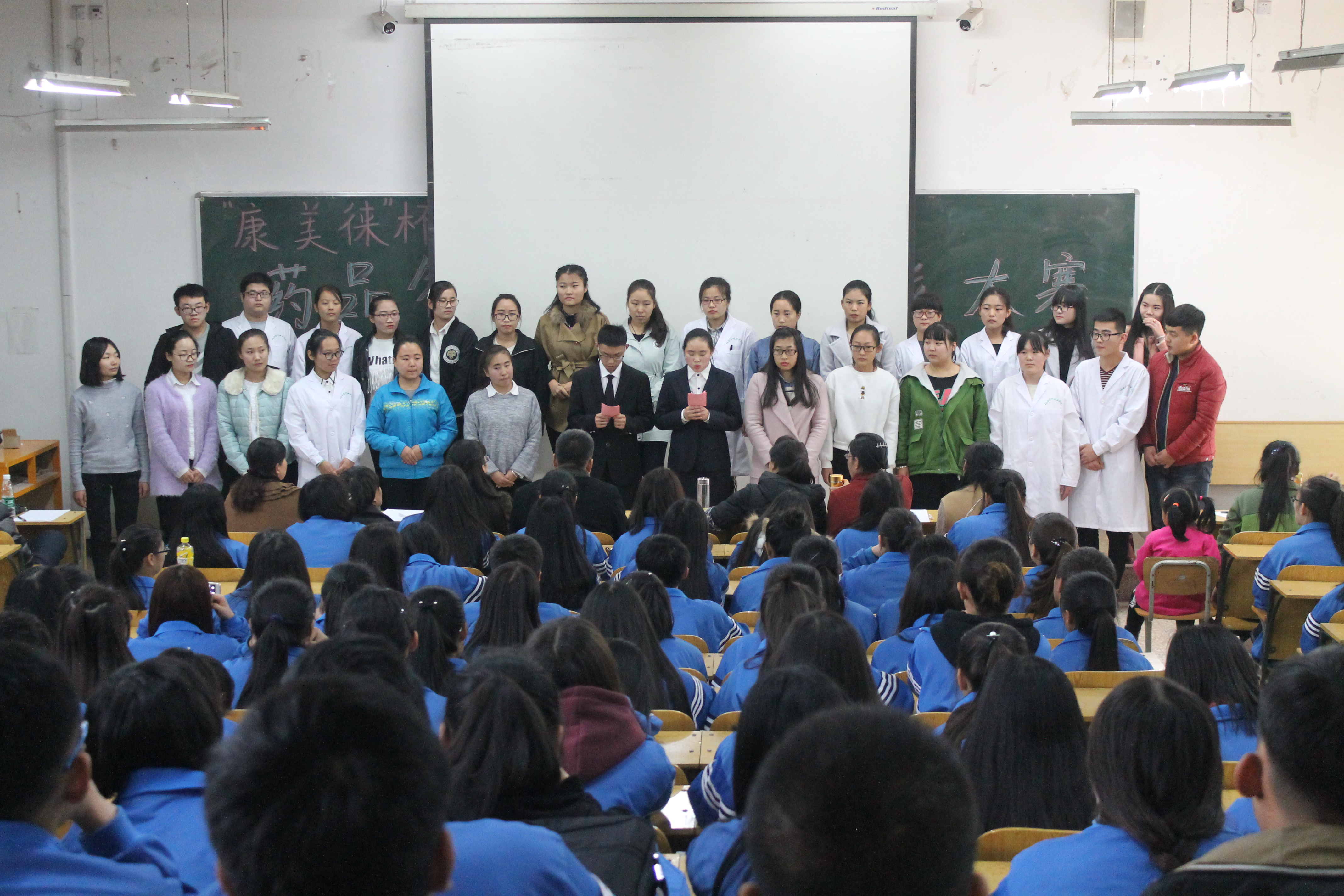 本次大赛分为初赛和决赛,初赛以药品销售中的顾客接待为题,同学们自行拍摄视频,总计收回42名学生的17份初赛作品。经过选拔,最终确定27名学生进入决赛。