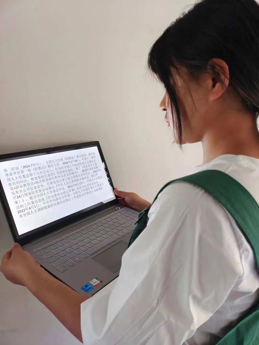 班会伊始,同学们首先观看了科普视频,了解了新《职业教育法》的“前世今生”。接着,在主讲人的带领下,同学们学习了新《职业教育法》的新提法、新政策,直观、深刻地感受到国家对职业教育的重视。在交流讨论环节,同学们畅所欲言,提出了自己对新《职业教育法》的思考,并表示要增强自信心,把握当下良好的学习机会,强技立身,努力成为高素质技能人才。