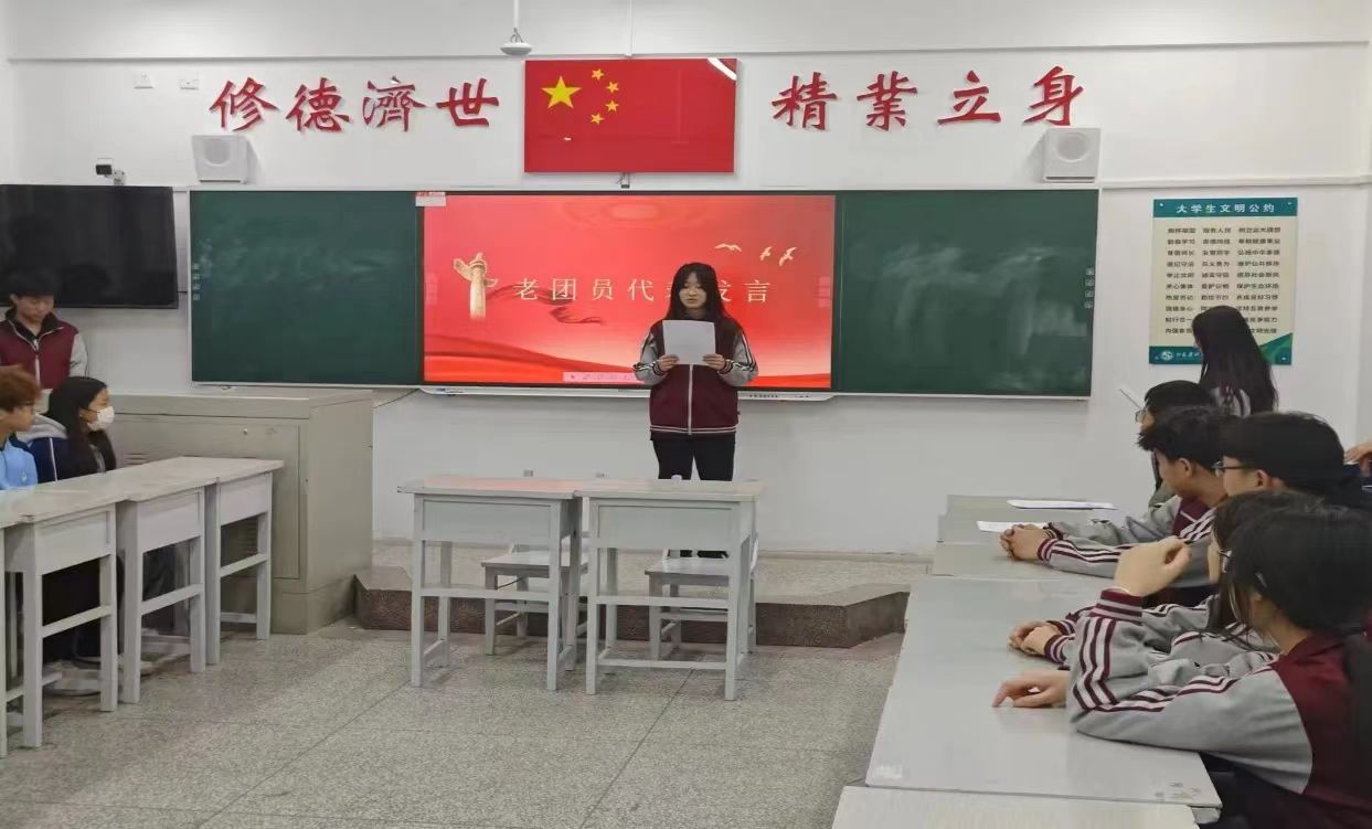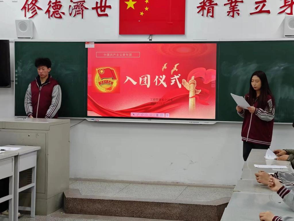 为加强我系共青团队伍建设,激励青少年坚定理想信念,绽放青春力量,勇担时代责任,2023年12月25 日,工商管理系举行新团员入团仪式。本次活动由组织部负责人主持。活动主要由宣布新团员名单、奏唱国歌、佩戴团徽、新团员宣誓、宣读团员义务和权利、老新团员代表发言、奏唱团歌,七部分组成。