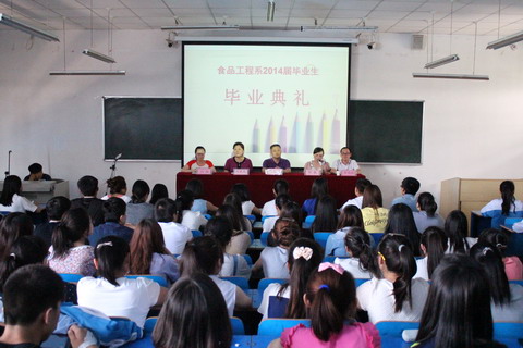 2014年5月28日下午,食品工程系2014届毕业典礼在阶教隆重举行。院党委委员、副院长邹本贵应邀出席,系领导班子、全体教师、2014届全体毕业生和12、13级学生代表参加了毕业典礼。典礼由系党总支副书记(主持工作)郁敏主持。