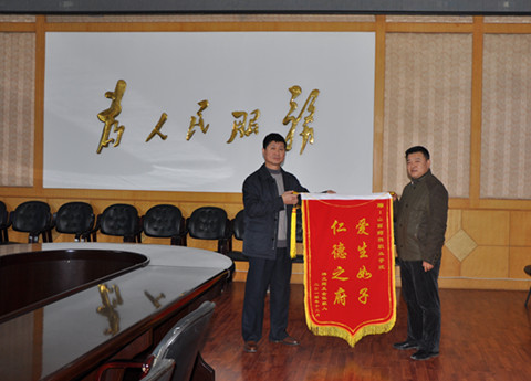 2014年12月17日下午,我院食品工程系大二404班韩文辉同学的家长心怀感激地来到学校,真诚地将一面印有“爱生如子,仁德之府”字样的锦旗送到我院副院长胡尔雅手中,以表达对学院深深的感谢之情。