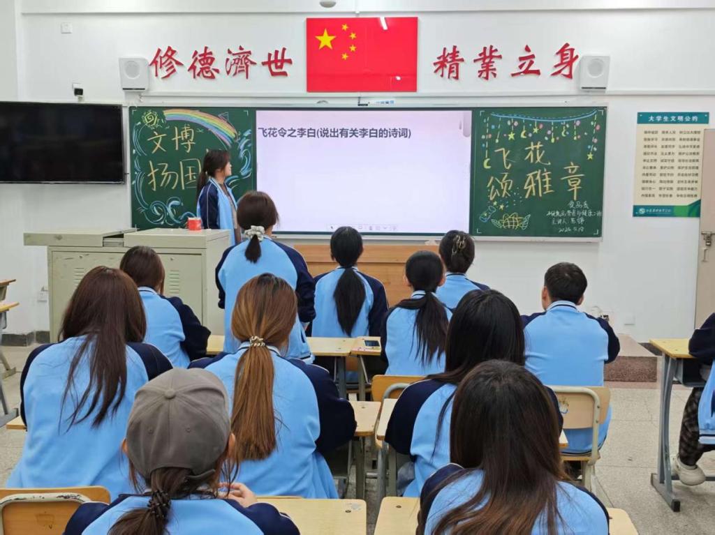 活动伊始,主讲人向同学们介绍了本次活动的主题。紧接着,现场采用飞花令的形式,要求参赛者们围绕特定的关键字进行诗词接龙。每位参赛者都全神贯注,积极思考,争取在最短的时间内吟咏出符合规则的诗句。活动过程中,选手们思维敏捷,诗词佳句信手拈来,充分展示了同学们深厚的诗词功底以及对传统文化的热爱。其中,还巧妙地穿插了观众互动答题环节学生们积极参与,热情高涨,不仅加深了对古诗词的理解,还享受了参与其中的乐趣。
