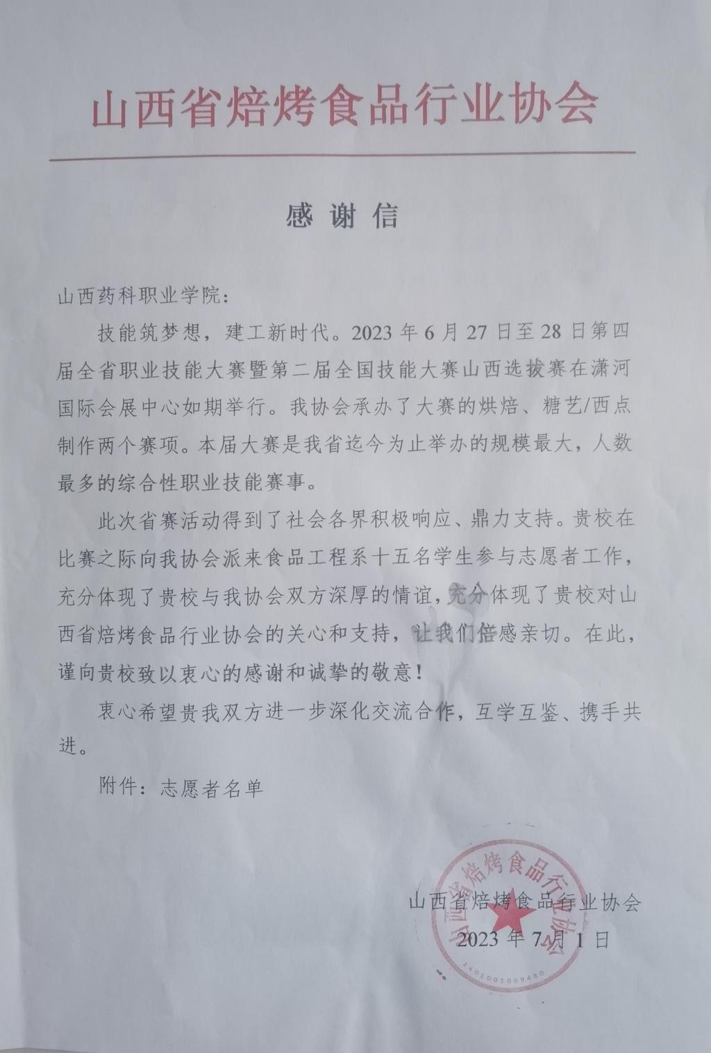 此次志愿者服务专业技能大赛活动,作为落实学院第三课堂暑期社会实践的一项内容,既体现了我系学生的志愿精神,又是我系与合作企业——山西省焙烤食品行业协会共同育人的一次实践,推动我系“食品类专业性志愿服务”省级文化育人品牌项目建设更趋成熟。