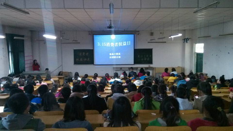 讲座中,主讲人为大家讲述了国际消费者权益保护日的由来,以及消费者合法权利的内容等相关知识,结合不同商品,详细讲解如何从生产日期、条形码、保质期、注册商标鉴别商品的优劣真伪。随后,主讲人从学生食品安全应注意的问题、如何分清食品保质期和保存期、如何选购饮料、十大垃圾食品及危害等方面进行生动地阐释和强调,让学生了解了有关食品卫生安全的专业知识,提高了学生的食品安全责任意识。