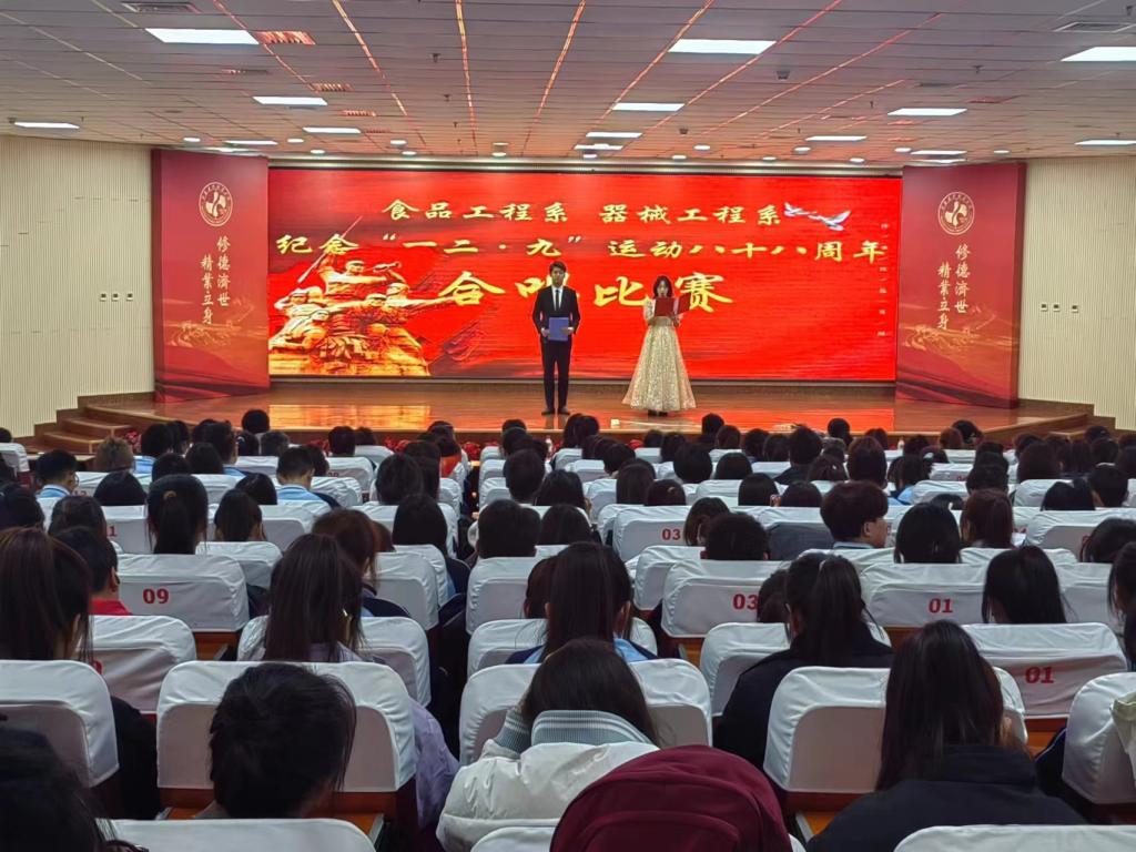 为纪念“12.9”学生爱国运动88周年,铭记先辈们的英勇事迹,继承和发扬党的优良传统,激发师生爱国主义情感,丰富校园文化生活,促进师生素质的全面提高,12 月 7 日下午,食品工程系器械工程系在报告厅举办纪念“一二•九”运动88周年合唱比赛。由院学生会主席申杰磊、系党总支书记范张姣、辅导员史大鑫、李争春、王丽娜担任评委出席本次活动,以及大一大二全体学生共计四百余名学生参加。席本次活