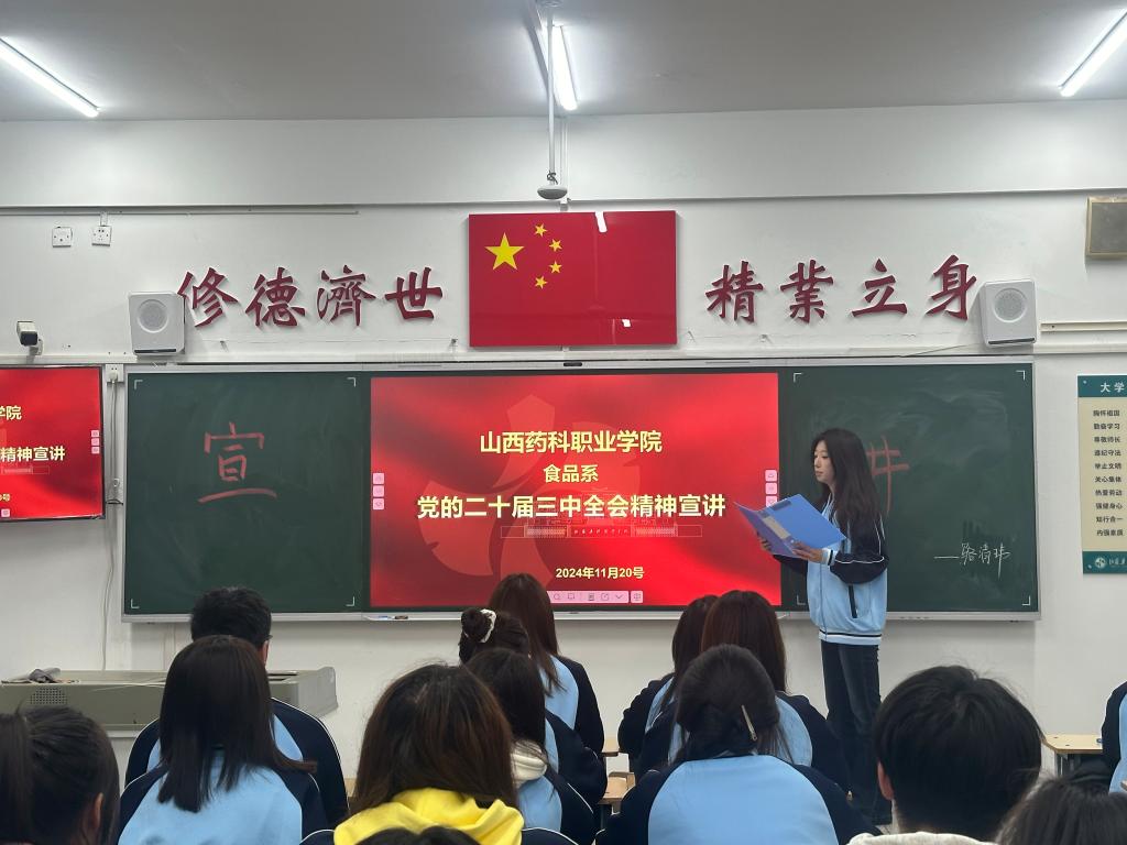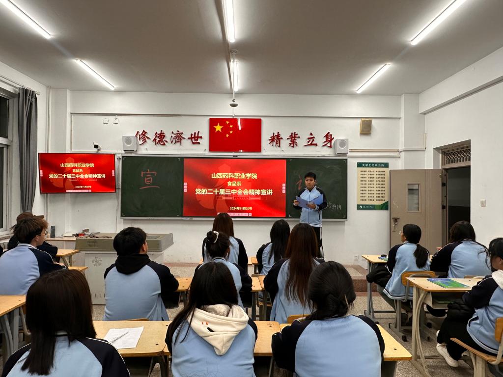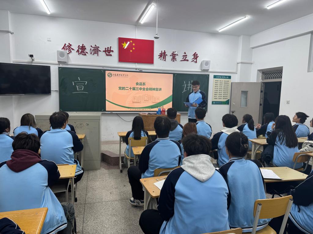 为深入学习贯彻党的二十届三中全会精神,引导同学们坚定理想信念、勇担时代使命,食品系各团支部于11月13日开展“学习贯彻党的二十届三中全会精神”主题宣讲活动,由食品系2024年入党积极分子进各班级担任主讲。
