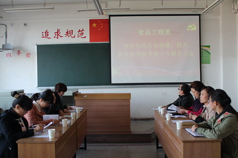根据我系深入开展党的群众路线教育实践活动实施方案的安排,10月21日下午,食品工程系党总支在东教学楼406室组织召开以“坚持为民务实清廉,提升教育教学服务能力”为主题的专题学习会,全体党员干部参加了学习会,会议由系党总支副书记(主持工作)郁敏主持。
