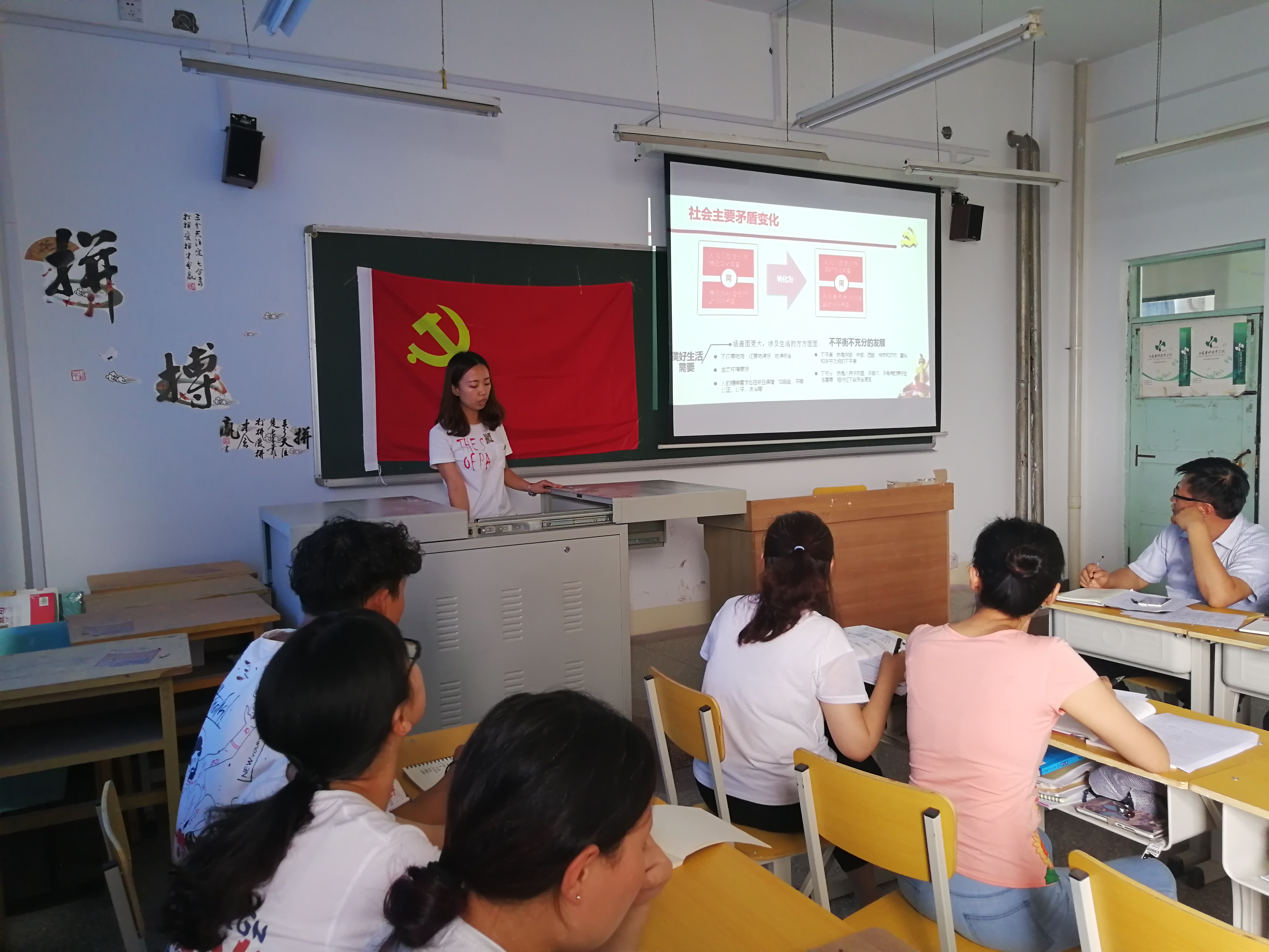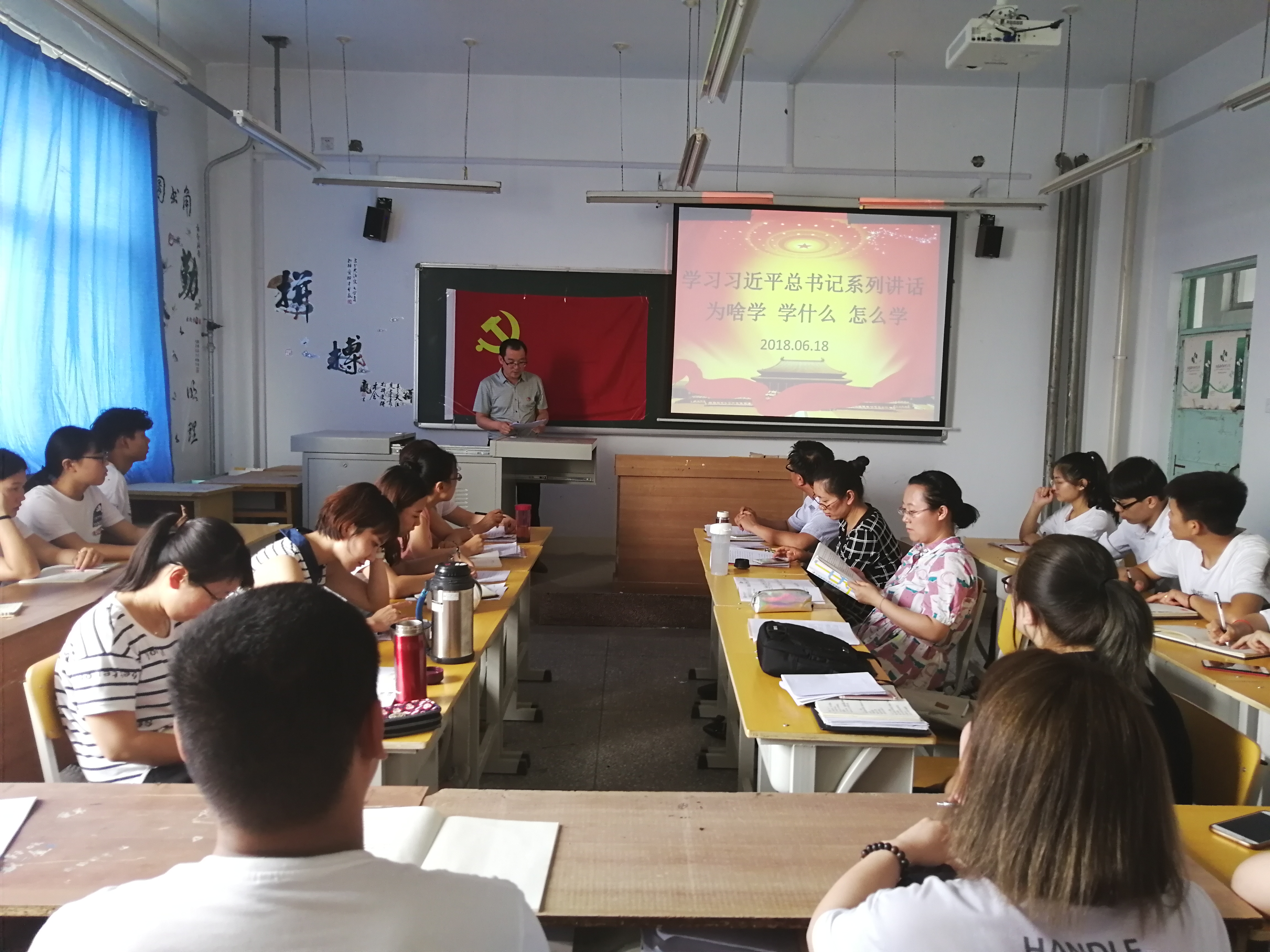 教师支部书记杨兆艳同志和学生支部书记张玲同志讲题为“坚守共产党人的价值追求”、“深刻把握习近平新时代中国特色社会主义思想”的主题党课。教师支部党员罗爱国同志和学生支部党员高扬同志分别就学习贯彻习近平新时代中国特色社会主义思想和党的十九大精神讲微党课。