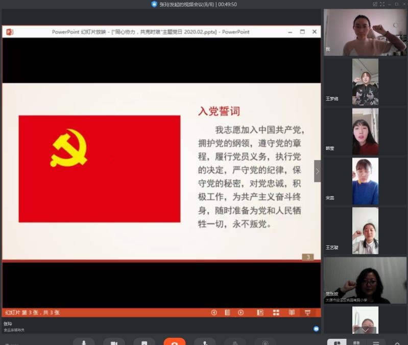 最后,在支部书记张玲的带领下,全体党员举右拳过肩,重温入党誓词。紧握的右拳传递着大家昂扬的斗志和必胜的信心。