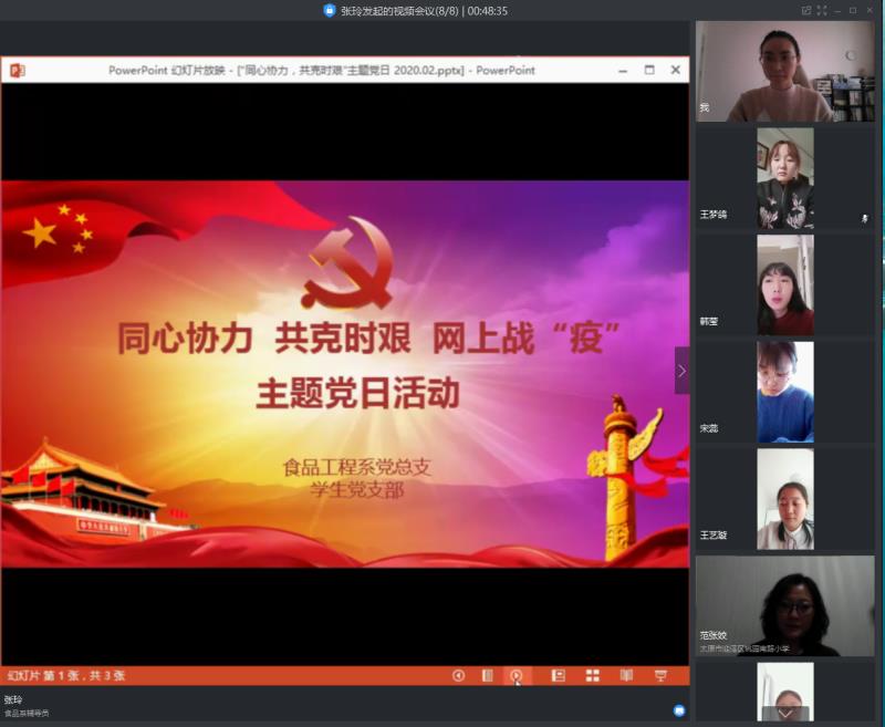 为进一步发挥基层党组织在抗击疫情中的战斗堡垒作用,激发广大党员干部把思想和行动统一到习近平总书记重要指示精神和各级决策部署上来,立足本职岗位全力以赴投入这场人民“战疫”中,2月29日,食品工程系党总支学生支部通过网上视频会议形式开展“同心协力,共克时艰,网上战‘疫’”主题党日活动,支部全体党员和部分入党积极分子参加活动。