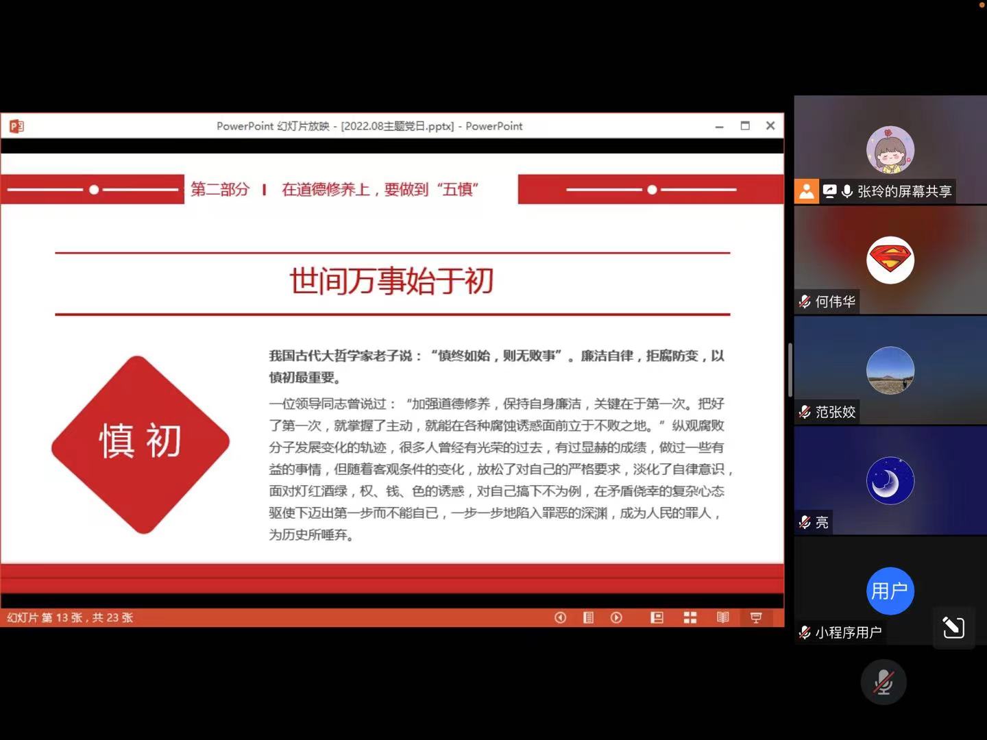 会上,张玲同志首先带领全体党员共同学习了习近平总书记关于全面从严治党的重要论述及文章《深刻把握全面建设清廉山西的理论基础、历史启示和实践要求》,随后进行了主题为“坚守底线,不越红线”的宣讲,提醒每一位党员始终保持清醒的头脑,自觉筑牢思想防线。最后,与会党员共同观看了廉政警示教育片《零容忍》第一集:不负十四亿,以反面典型为镜鉴,告诫党员干部常思自身不足、长敲自警之钟、常怀律己之心,常思贪欲之害,强化党员干部心存敬畏、坚定政治立场、严守纪律底线的思想。