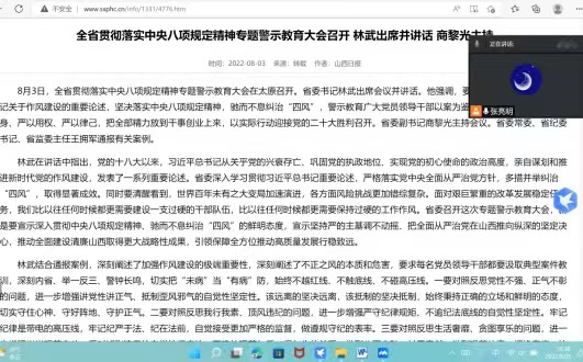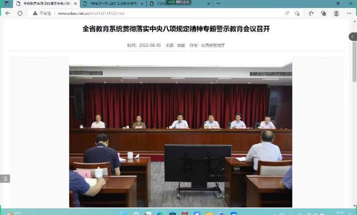 会上,与会人员集中学习了全省贯彻落实中央八项规定精神专题警示教育大会精神,全省教育系统贯彻落实中央八项规定精神专题警示教育会议,专题学习学院《全面建设清廉学校实施方案》,并集中观看“中国这十年·山西”主题新闻发布会,大家纷纷表示要牢记领袖嘱托,慎独自省、真抓实干,以优异成绩迎接党的二十大胜利召开。