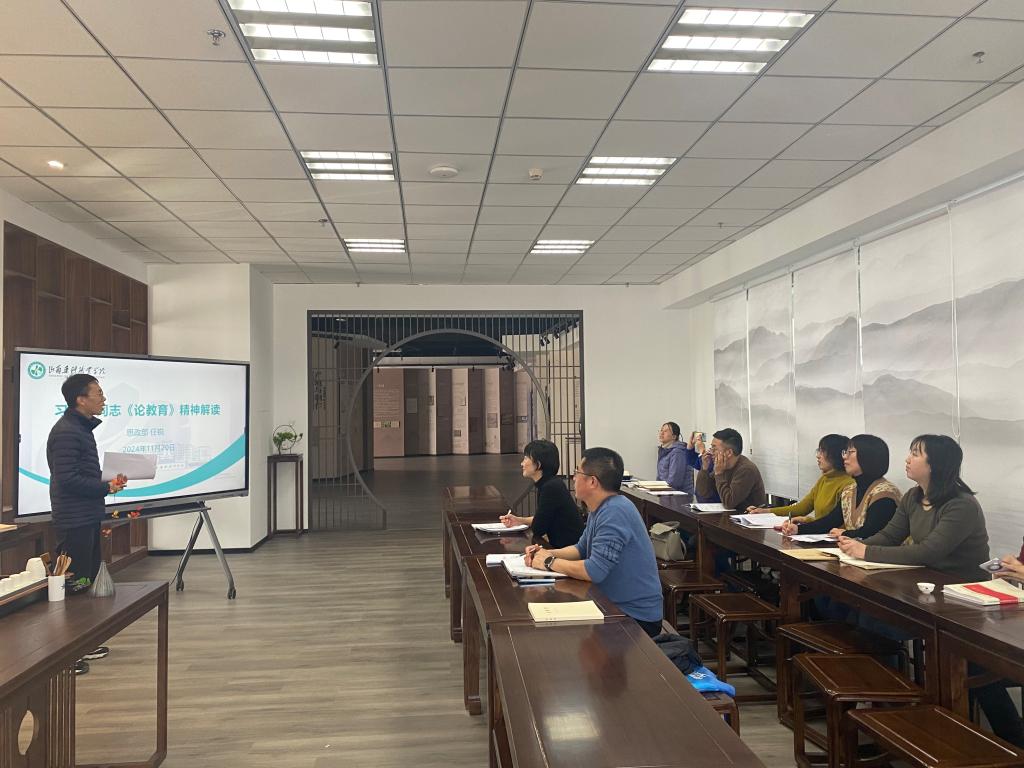 为全面贯彻落实习近平新时代中国特色社会主义思想,深化对习近平同志《论教育》精神的理解,进一步提升教师思想政治素养和教育实践能力,11月27日下午,食品系邀请思政部任锐老师为全体教师作专题讲解。本次活动旨在引导教师深刻领会习近平同志《论教育》的时代背景、核心逻辑和实践价值,推动教育教学工作高质量发展。