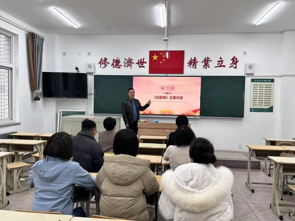 为深入学习贯彻习近平总书记关于教育的重要论述,推动党员教师坚定理想信念、增强职业教育使命感。2024年11月18日,食品系党总支书记申永政以“学习《论教育》的主要内容,做‘四有’好老师”为主题,为全体党员教师讲授了一堂生动而深刻的党课。