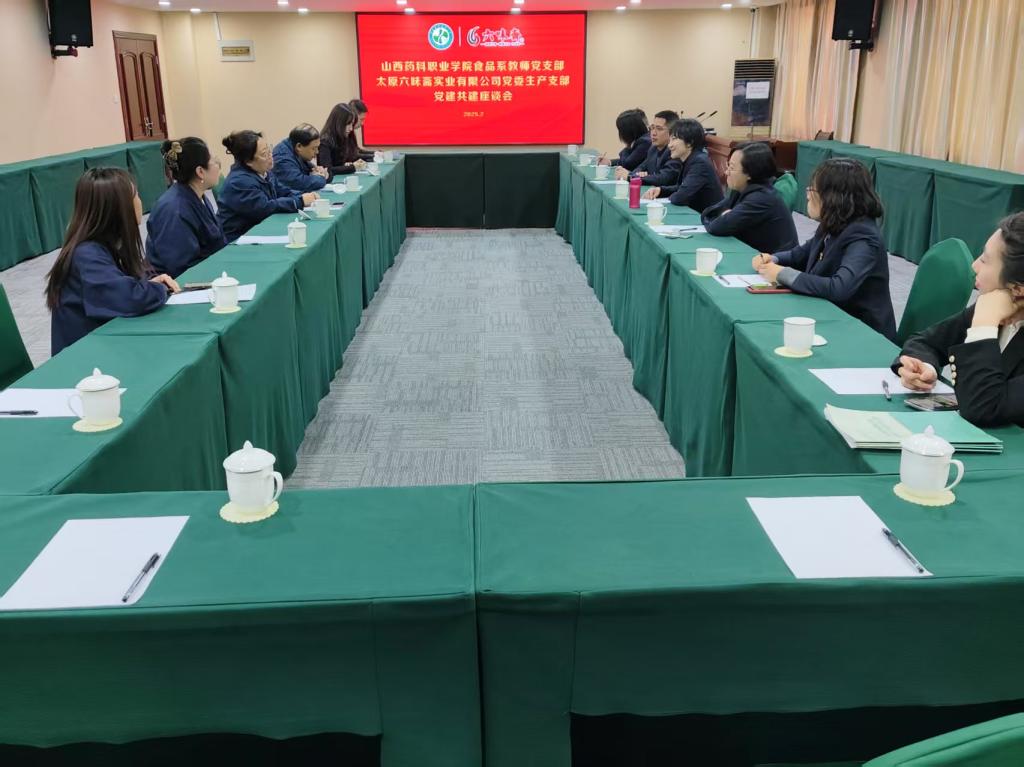 在随后的交流座谈会上,双方党支部围绕校企合作、人才培养、课程建设、实践教学等方面展开了热烈讨论。山西药科职业学院食品系教师党支部书记郭芸介绍了食品系的专业设置、人才培养方案以及近年来在教学改革、科研创新等方面取得的成果,并表示希望通过与六味斋的深度合作,进一步优化人才培养模式,提高学生的实践能力和职业素养,为食品行业培养更多高素质技术技能人才。六味斋党支部则分享了企业在食品生产、质检、研发等领域的技术优势,并表达了通过校企合作吸纳高素质技能人才的意愿。