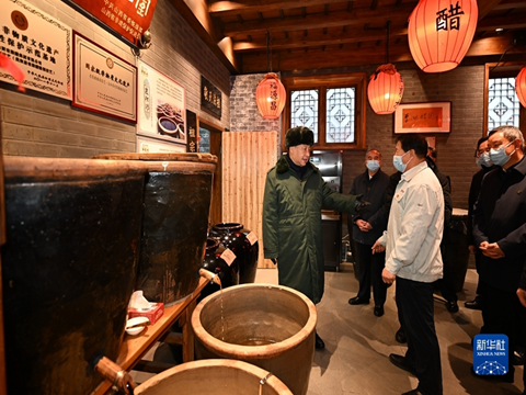 古城南大街年味浓郁。习近平沿街巷察看古城风貌,走进平遥牛肉店、推光漆器店、东湖老醋坊,了解当地文化遗产保护利用和开展特色经营情况,并购买了平遥牛肉、饺子醋等年货,还参与了陈醋发酵打耙。他指出,要做优秀传统文化传承者,保护好推光漆器等文化瑰宝,把富有民族特色的传统文化产业发扬光大、推向世界。现场群众纷纷向总书记问好,习近平向大家挥手致意,给大家拜年。