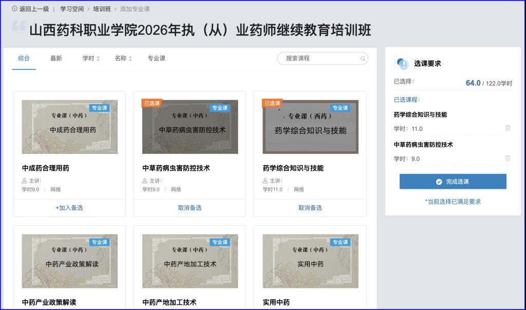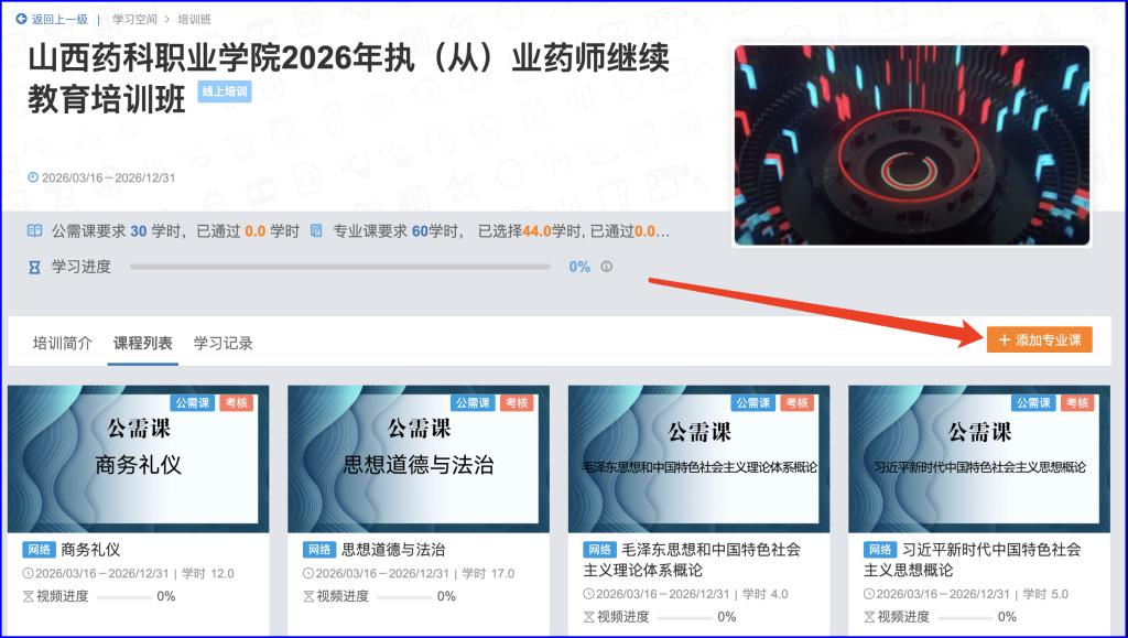(八)购买成功后,该培训班将自动显示在学习空间进入培训班详情页后,点击添加专业课按钮,勾选60学时的专业课课程。
