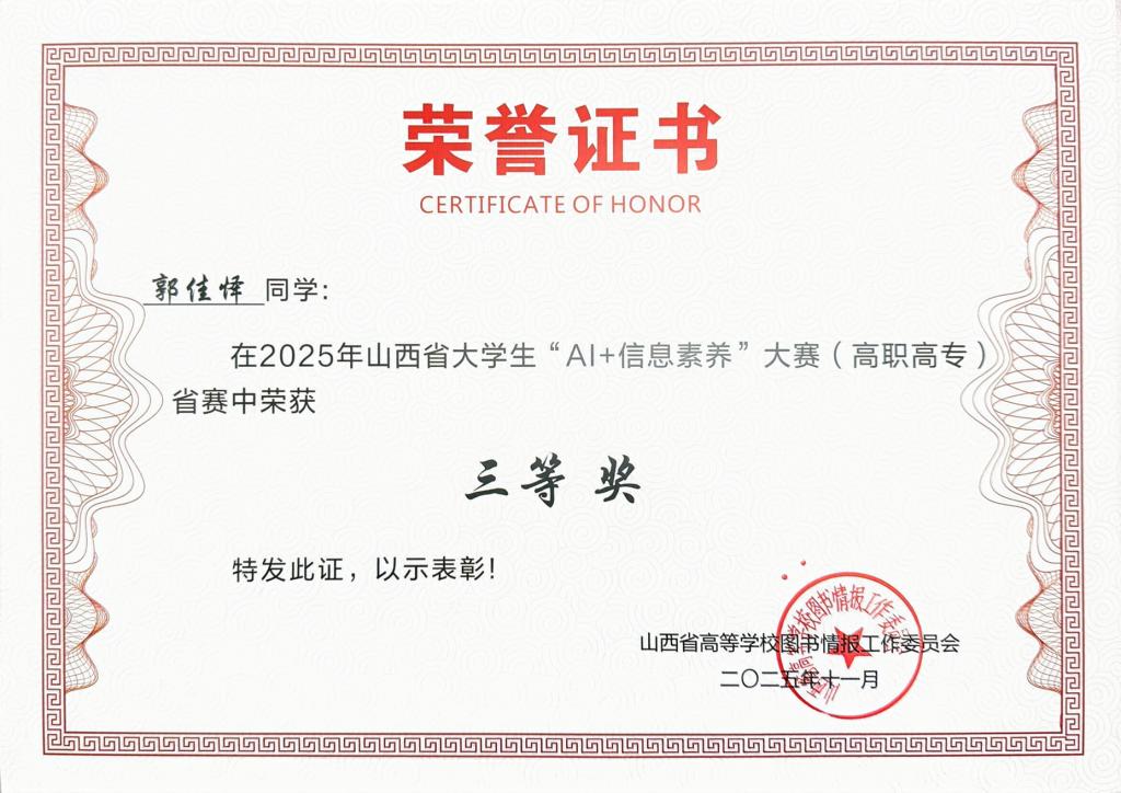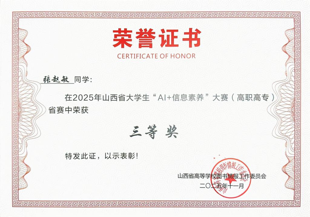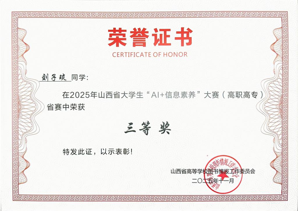 食品系学生在2025年山西省大学生“AI+信息素养”大赛(高职高专)中荣获三等奖