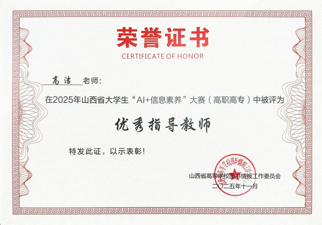 备赛阶段,高洁老师结合学生实际,围绕AI基础知识、信息检索能力、数据判断策略等内容进行系统辅导,帮助学生梳理知识重点,提升答题速度与准确率。凭借在指导过程中的耐心投入与显著成效,高洁老师荣获大赛“优秀指导教师”称号。