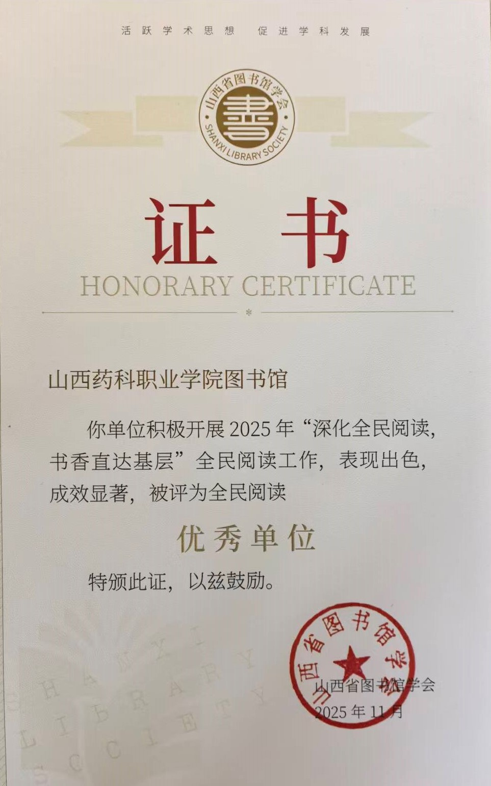 近日,山西省图书馆学会公布2025年全民阅读工作表扬名单,我院图书馆凭借体系化活动布局、创新化推广路径与实效化育人成果,斩获山西省全民阅读“优秀单位”荣誉称号,这一省级表彰既是对我院书香校园建设的权威认证,也是对图书馆全体同仁深耕阅读推广工作的充分肯定。