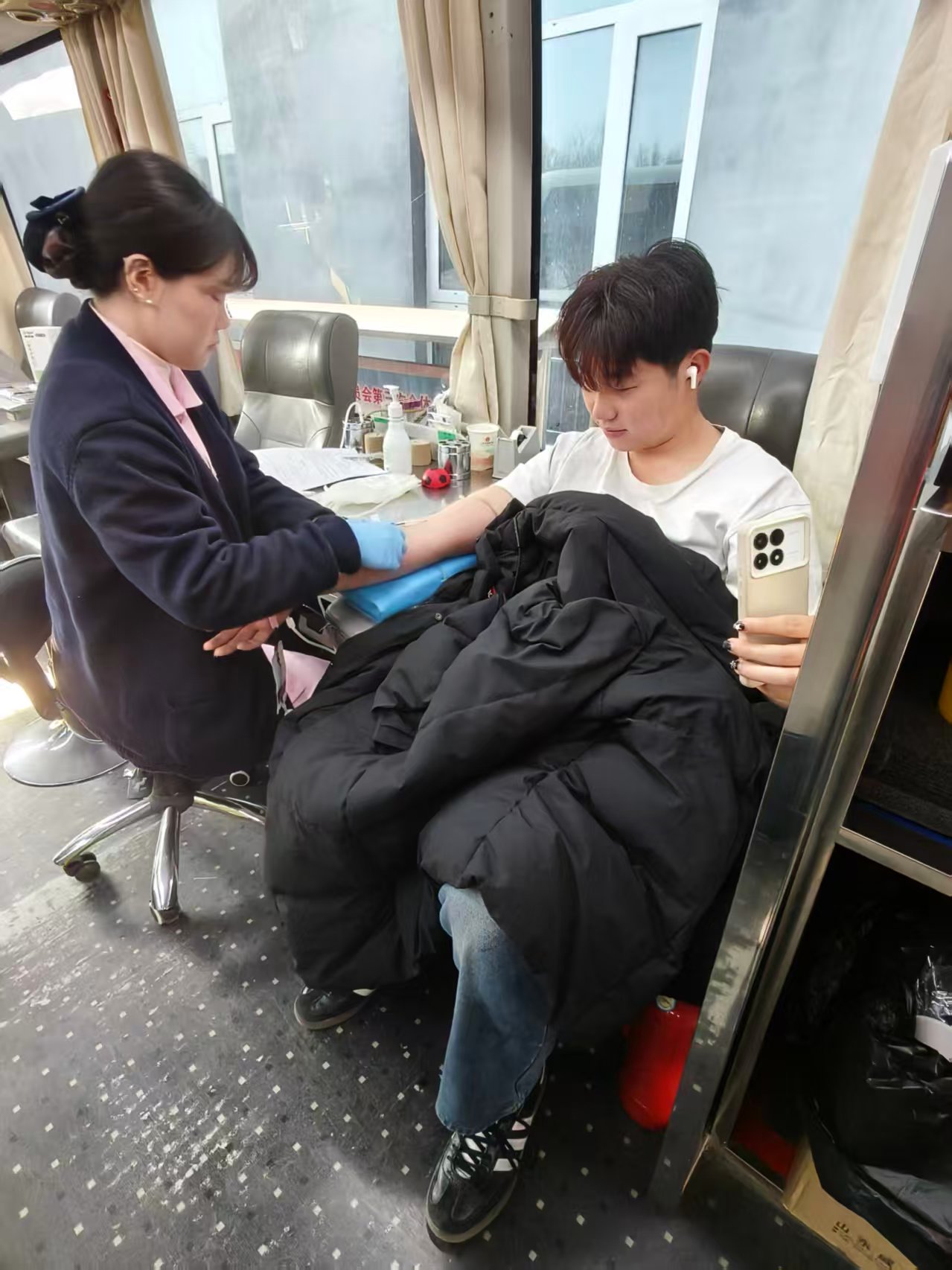 活动现场,尽管气温低下,但是同学们却因为“互助,友爱”志愿精神的驱动,参与热情丝毫未减。报名区,志愿者们细致核对献血者信息,引导大家完成填表、体检等流程;采血车里,医护人员严格遵循操作规范,为每一位献血者进行血液采集,同时贴心地准备了饼干与热水以及一系列的纪念品,每一个环节中都闪耀着互助友爱的光芒。这次的活动既展现出了生命的续航能量,也体现了我院学子践行无偿献血凝大爱,奉献爱心显文明和以志愿力量共建美好社会的青春风采。